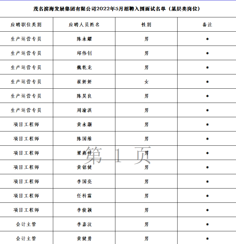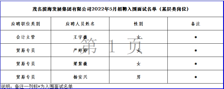 根據《茂名濱海發展集團有限公司2022年5月入圍面試名單》精神,現將入圍面試的名單進行公示。