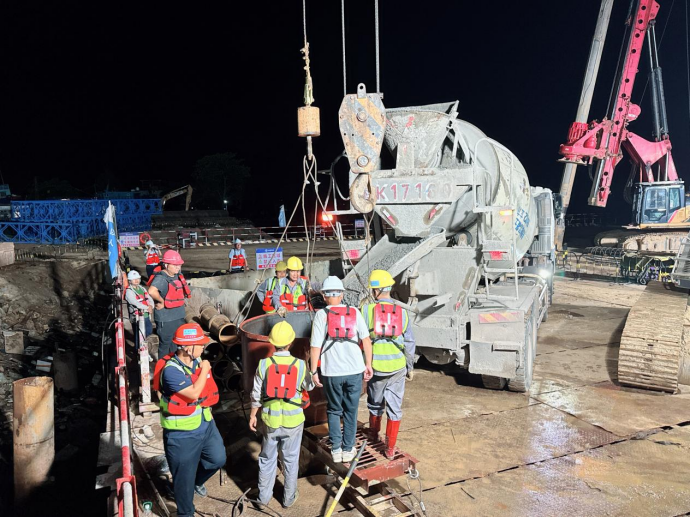 在施工現場,建設團隊嚴格依照標準化施工流程推進作業。從施打鋼護筒筑牢基礎防線,到旋挖機精準鉆孔;從初次清孔、鋼筋籠精準下放,再到安裝導管、二次清孔,直至完成水下混凝土澆筑,每一個環節都經過精密測算與嚴格把控。過程中,建設單位園區公司、監理單位、施工單位三方組成專項攻堅小組,全程駐守現場,通過技術交底、實時監測、動態調整,全力確保澆筑過程萬無一失。